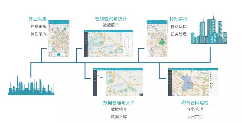 燃氣管網(wǎng)地理信息系統(tǒng)集外業(yè)采集、數(shù)據(jù)更新入庫、管網(wǎng)資產(chǎn)查詢統(tǒng)計、管網(wǎng)巡檢及移動辦公等系列軟件產(chǎn)品于一體,系統(tǒng)應(yīng)用覆蓋燃氣管網(wǎng)內(nèi)外業(yè)各環(huán)節(jié),可實現(xiàn)燃氣管網(wǎng)精細化、可視化、智能化生產(chǎn)運營。