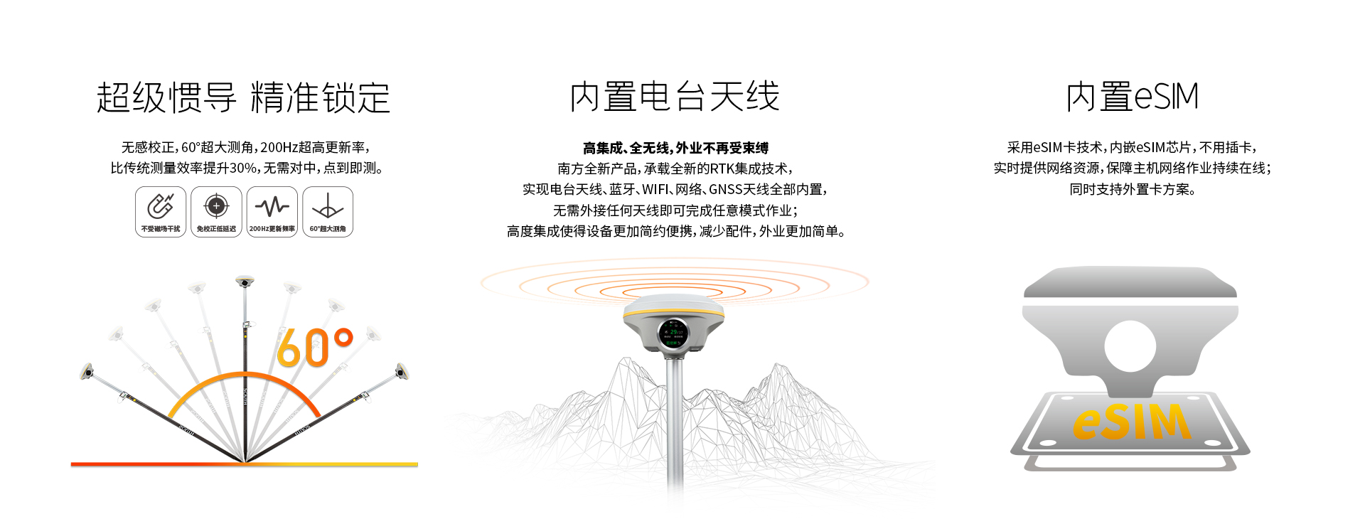 慣導(dǎo)傾斜測量 | 內(nèi)置IMU慣性測量傳感器,支持慣導(dǎo)傾斜測量功能,根據(jù)對中桿傾斜方向和角度自動校正坐標(biāo)。 |